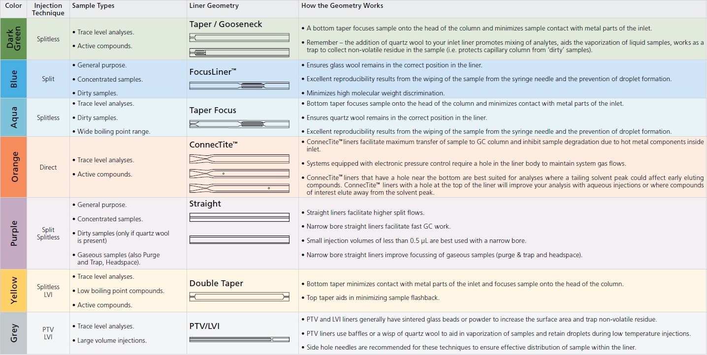 SGE ponúka veľký výber linerov pre rôzne prístroje (Agilent, Perkin Elmer, Shimadzu, Thermo/CE/Fisons, Varian/Bruker atď. ) s farebným kódovaním podľa geometrie a typu. Linery sú dostupné v balení po 1, 5 resp. 25ks.